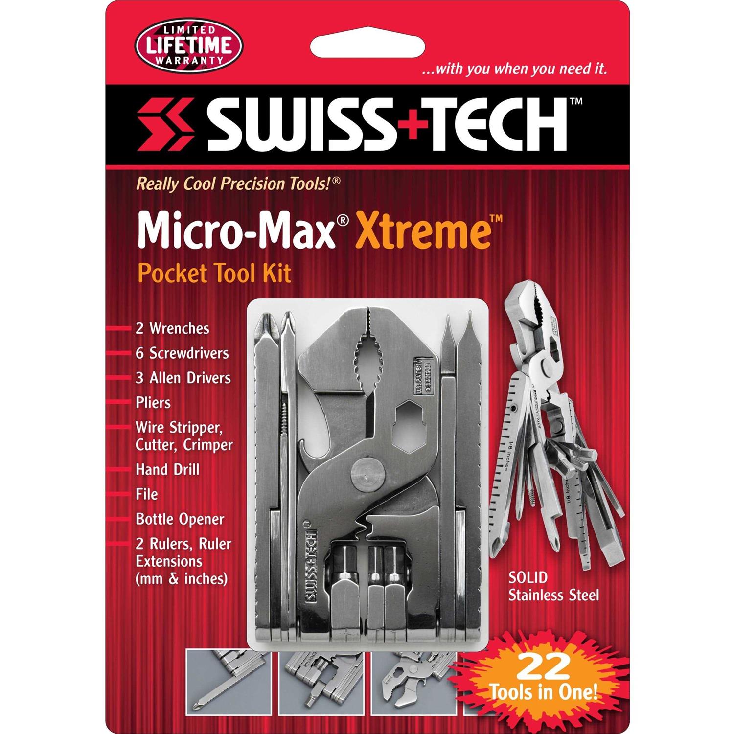 The Micro-Max Xtreme offers 22 different tools in one pocket-sized tool. The heavy-duty, stainless steel tools handle repairs with ease. Patented folding mechanism allows the full-sized tool to transform into a size small enough to carry in a tool belt or pocket, glove box or home emergency kit. Integrated locking mechanism keeps legs closed and open.