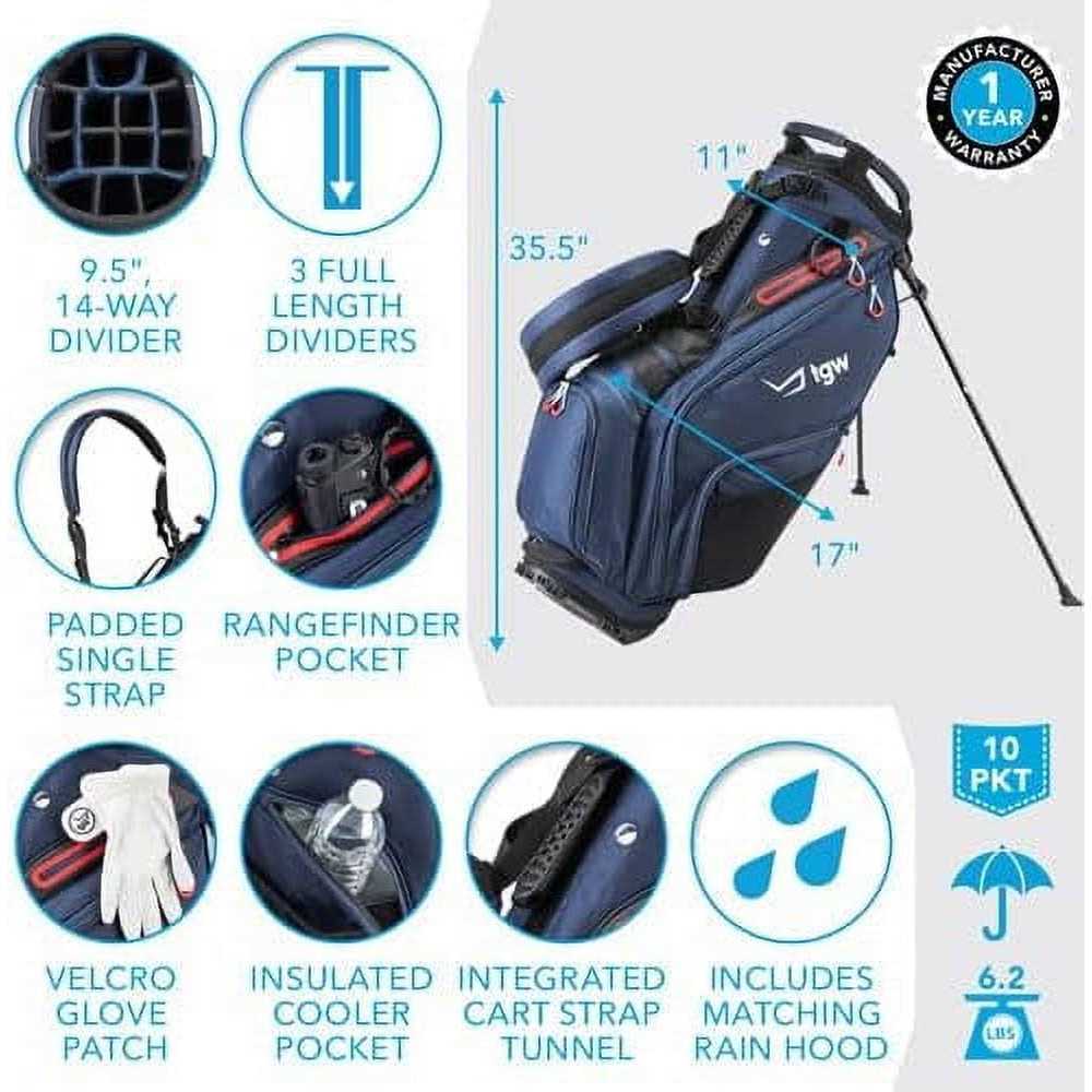 Brand:TGWColor:Grey|Black – Features:Separate putter well designed to hold oversized grips – Three top lift handles with rubberized grip for ease of lifting – One lower lift handles for extra ease when getting bag in and out of car trunk – Quick activation – A stand with ultra-lightweight premium aluminum legs – ARubber feet on – A aluminum legs provide added stability on any terrain – UPC: 649862902680