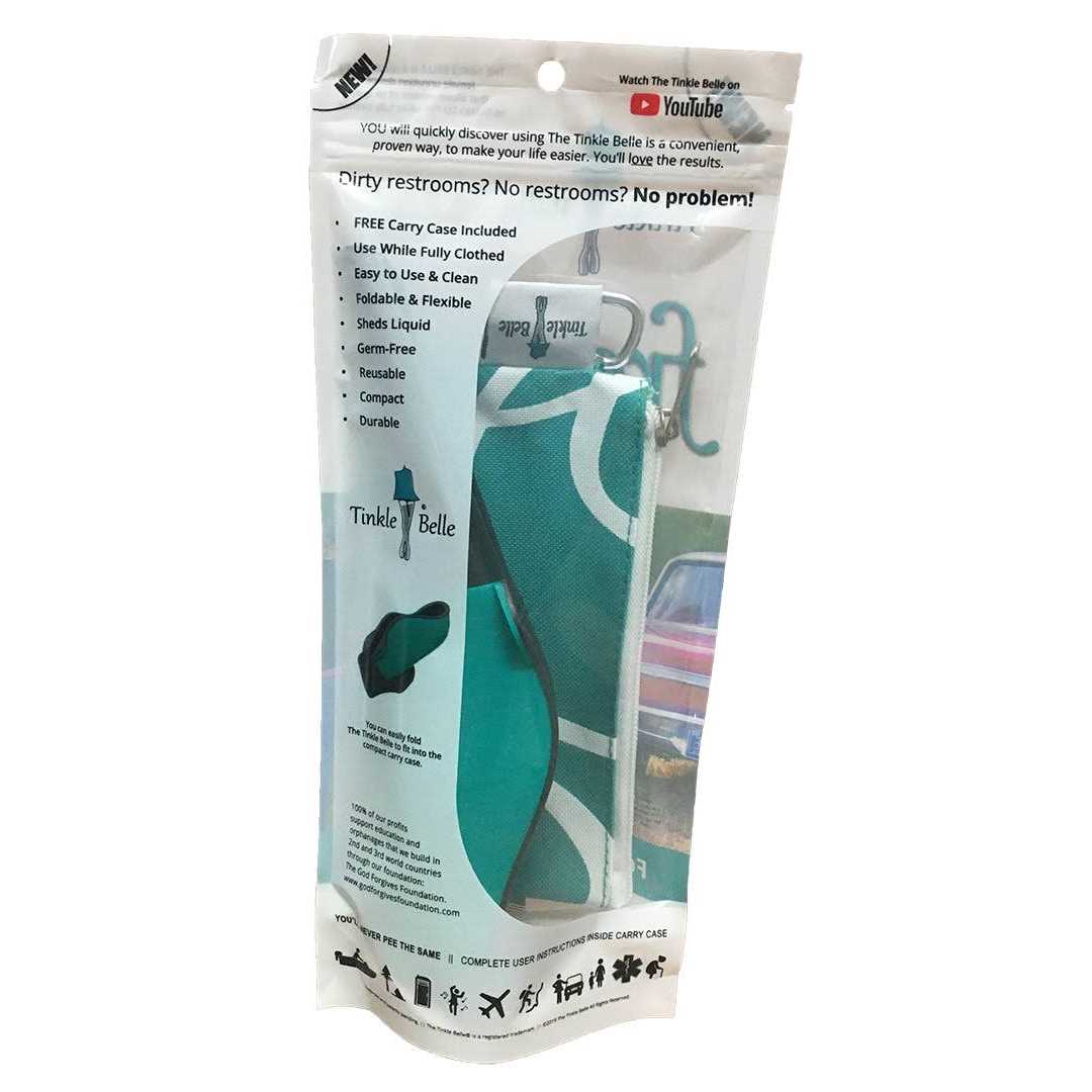 The Tinkle Belle is a portable female urination device that allows all women to pee easily and reliably while standing and without removing clothing! No more squatting or hovering. Avoid dirty toilets and the lack of restrooms during outdoor activities or road trips. Go anywhere! Great for camping, hiking, boating, outhouses, road-trips, airplane travel, after-surgery recovery, mobility issues, and avoiding dirty public restrooms! Hydrate more without worry about where the next rest-stop will be. The Tinkle Belle is durable, foldable, and includes a discreet and stylish carry-case. Made of medical-grade plastics with anti-microbial properties to avoid odors. Hydrophobic to shed excess liquid.