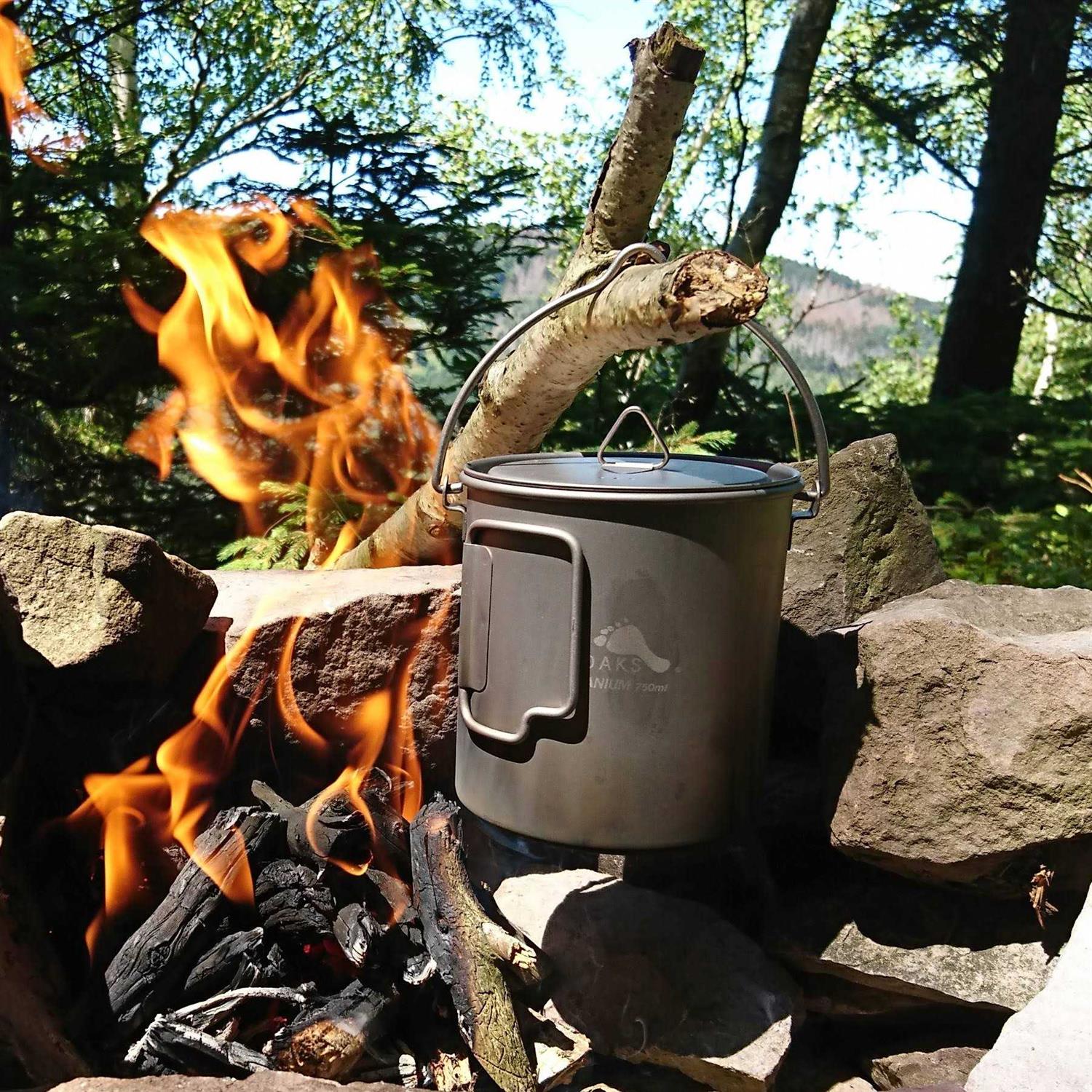 Do you enjoy cooking over camp fire? Well who doesn’t? TOAKS Titanium 750 ml pot with bail handle is an essential piece of gear for the lightweight adventurer who uses natural resources for heating water and cooking. Just use a sturdy stick to place the pot over the fire and remove when finished. On the other hand if there are rules against open fires or forest fire warnings you can remove the bail handle making the pot more compact and rely on conventional gas stoves. The pot contains gradations which make measuring easy. Titanium as a material guarantees a low weight (110 g) and durability for a life time. You can fit a 110 g gas canister and a small gas stove inside the pot.