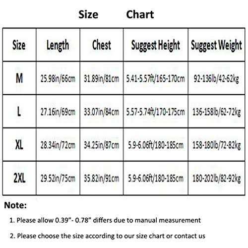 Rib Protectors by Topeter. Details:Feature: Material: 80% polyester + 20% spandex Padded: yes Color: Black Suitable for soccer, football, basketball, contact sports, paintball, snowboard, skiing, rugby, rush guard, etc. Size info: M: Length: 25.98in/66cm, Chest: 31.89in/81cm,Suggest height: 5.41-5.57ft/165-170cm,suggest weight:92-136lb/42-62kg L: Length: 27.16in/69cm, Chest: 33.07in/84cm,Suggest height: 5.57-5.74ft/170-175cm,suggest weight:136-158lb/62-72kg XL: Length: 28.34in/72cm, Chest: 34.25in/87cm,Suggest height: 5.74-5.9ft/175-180cm,suggest weight:158-180lb/72-82kg 2XL: Length: 29.52in/75cm, Chest: 35.82in/91cm,Suggest height: 5.9-6.06ft/180-185cm,suggest weight:180-202lb/82-92kg Note: 1. Please allow 0.39”.