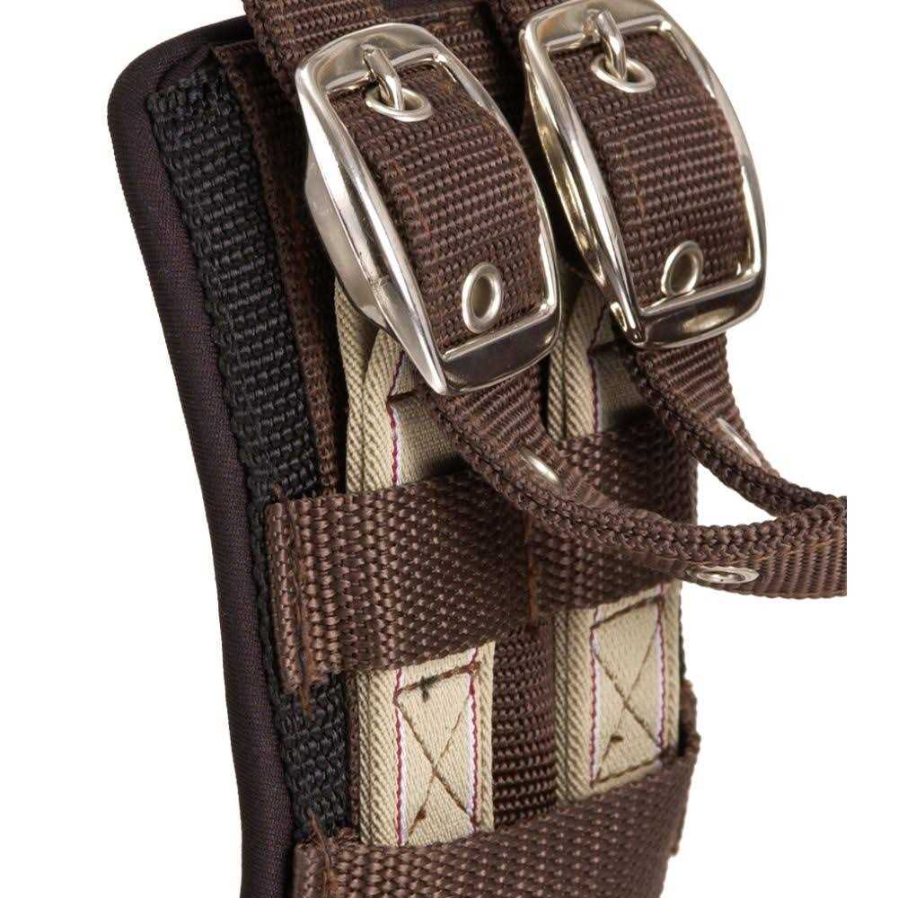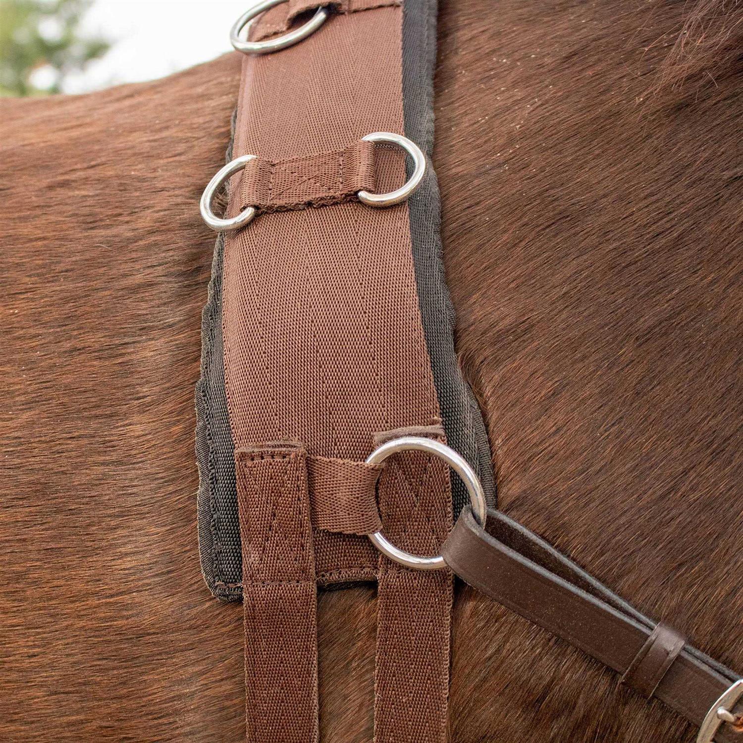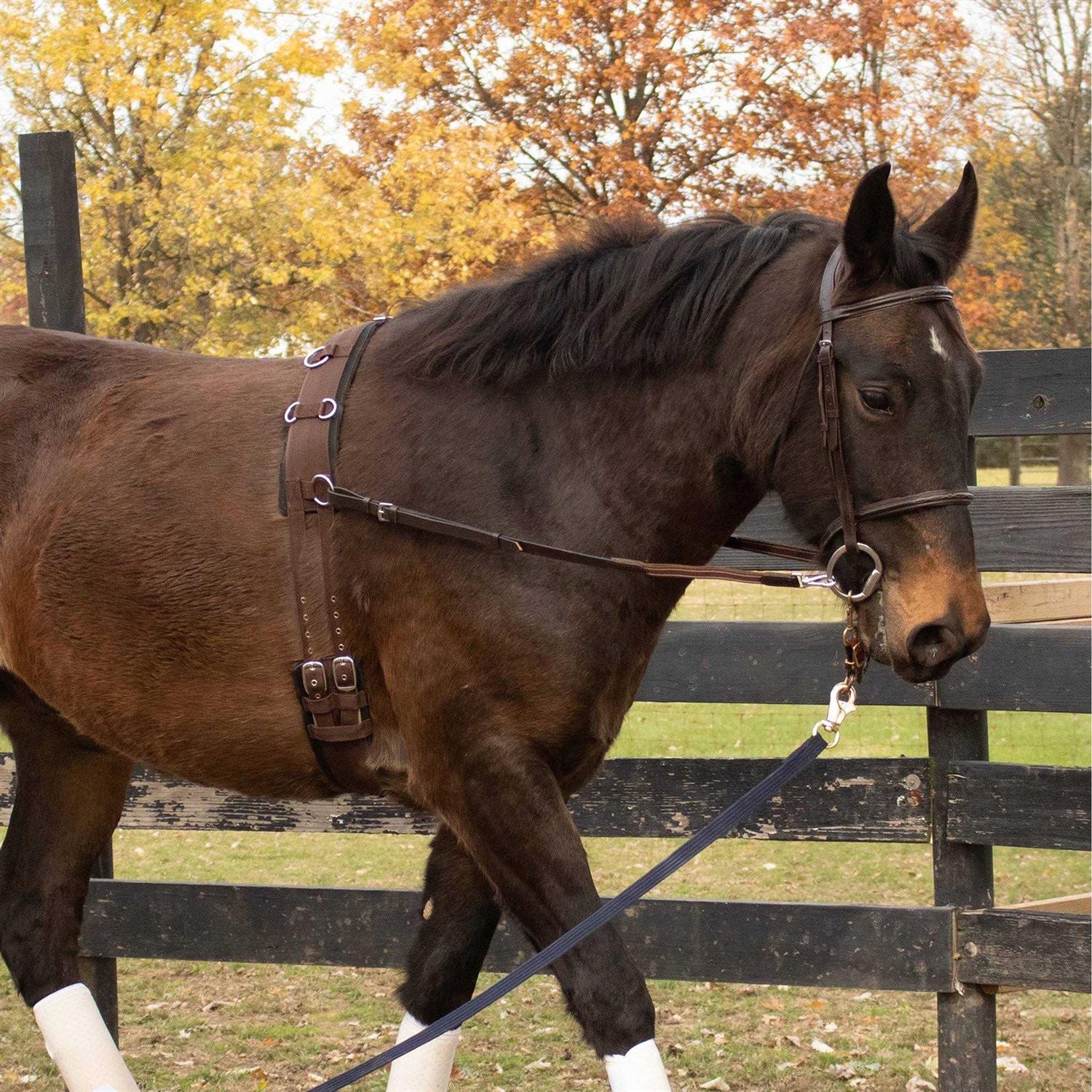 Professionally engineered training surcingle made of durable nylon with PVC neoprene lining. The rings and dees are correctly positioned for attaching training aids. Girth adjusts on both sides to equalize pressure. Ideal for most schooling needs. Brown. Full Size.