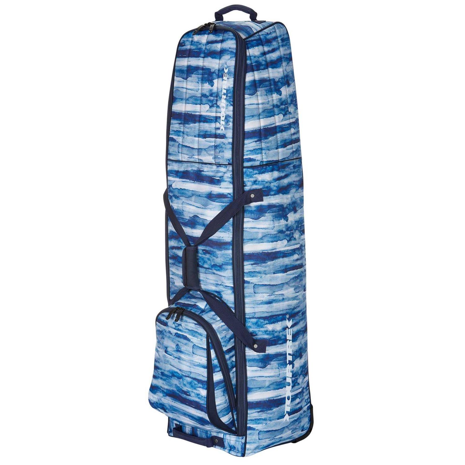 Designed to fit most stand and cart golf bags, the TourTrek TC PRO Travel Cover features 360° padding to protect club heads, full-length horseshoe zippers for easy loading, and top handle/duffle straps for easy lifting. In addition, the durable base has in-line wheels for stability and maneuverability. Interior pockets, oversized external shoe bag and an integrated ID card holder provide additional storage. FEATURES: Soft side travel cover 360° padding protects club heads Dual, full length horseshoe zippers for easy loading Top handle and duffle straps for easy lifting 2 interior pockets for additional storage Oversized exterior shoe bag Durable base and in-line wheels for stability and maneuverability Lockable zippers Integrated ID card holder Central internal strap secures golf bag Designed to fit most stand and cart golf bags Dimensions: 14” L x 14” W x 52” H Weight: 6.6 lbs.