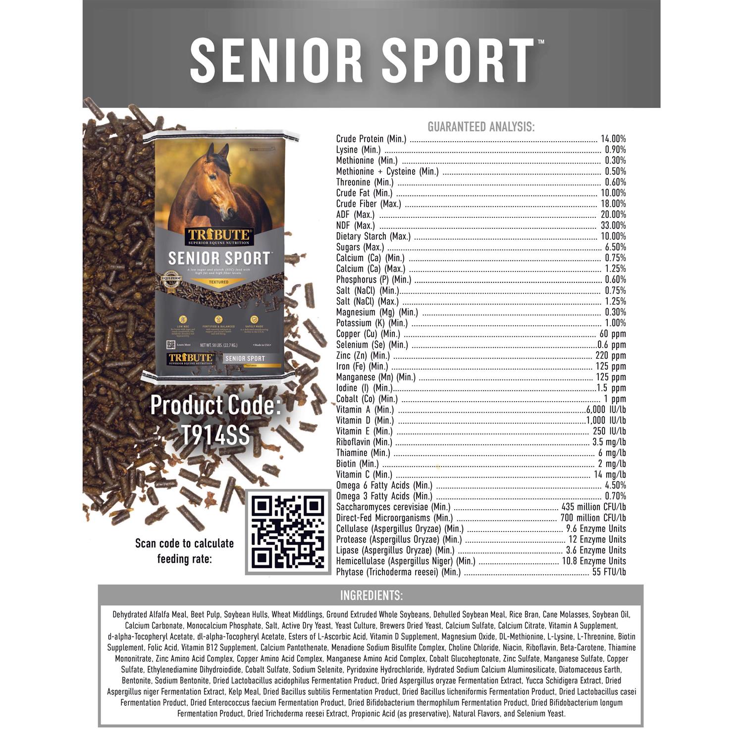 Complete feed for all mature horses that has a lower NSC and a high fat content. Senior Sport contains highly digestible fiber and high fat for calmer performances without loss of energy or condition. Added Vitamin E to support muscular development and conditions such as tying up and is beneficial to the immune system.