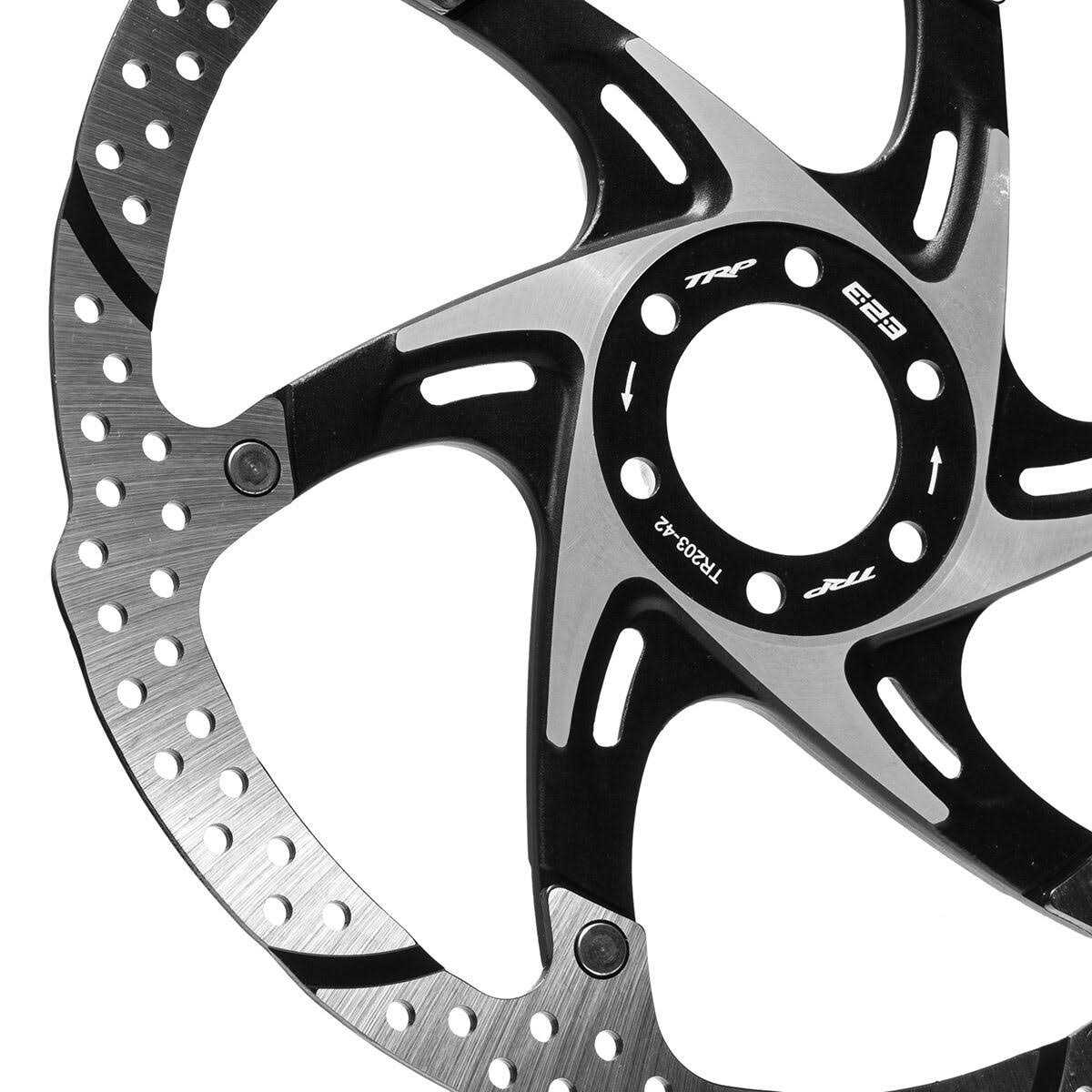 TRP’s two-piece rotors offer superior heat dissipation due to the aluminum center as well as excellent stiffness to provide you with confidence in your braking. Two-piece is now combined with TRP’s new slotted rotor design now with a 2.3mm thickness for DHR and E-MTB only. Six recessed slots create channels to allow water, mud, and other debris trapped between the pad and rotor to escape under braking. When debris gets trapped between the pad and rotor braking power is dramatically reduced, but these recessed slots maintain a more consistent brake feeling in mixed conditions. Includes rotor, 6 fixing bolts, and hex wrench. For TRP DH-R and E-MTB Calipers Only.