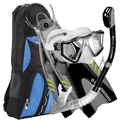 Looking for a great Snorkeling Set for the upcoming season? The US Divers Lux LX Purge Mask is an adult sized mask that one-size-fits-most. The mask is a four-window design for a panoramic view. This tempered glass lens mask has a hypoallergenic silicone double feathered edge skirt with a wide split strap design for a perfect fit and ultimate comfort on the face. The straps Pro-Glide Buckles provide for easy adjustments. The mask is equipped with a one-handed nose pocket for easy ear equalization. The Lux LX Purge is a medium volume mask design. In the bottom of the nose pocket is equipped with a one-way purge valve. The patented soft purge is for improved comfort and effortless clearing of water. The Phoenix LX Snorkel has a submersible, dry top with pivot dry technology – designed to keep-water-out of the breathing tube above and below the surface of the water. The snorkels ergonomic silicone mouthpiece provides comfort and reduces jaw fatigue. The snorkels flex section maximizes comfort and improves fit and the one-way purge va lve make clearing any residual moisture in the contoured snorkel tube easy. The Phoenix LX is equipped with an easy-to-use snorkel keeper for attachment to the mask. The US Divers Pivot Fins features pivot flex technology that allows for reduced fin length while providing increased efficiency and comfort. The short blade design is great for travel. The Fins has a soft and comfortable foot pocket with composite adjustable buckle heel strap and large strap finger loop for easy donning and doffing. This great snorkeling set comes with a fabric and mesh transport and storage bag for convenience. The bags mesh panels allow rinsing of the gear set while still in the bag. Just dump the whole bag in the rinse tank on the dock or back at the resort and hang to drip dry while you enjoy the rest of the day’s adventures. Bag has zippered closure and carry handle for transport.