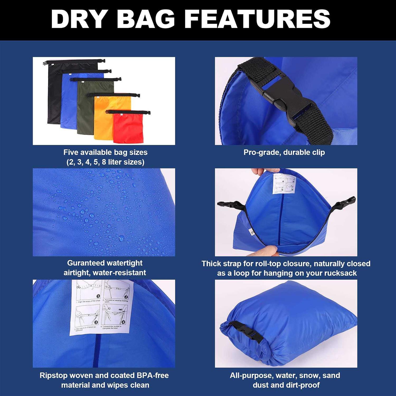 MULTIPURPOSE Waterproof Camping Bag: Whether you’re hiking, camping, canoeing, kayaking, boating or fishing, our waterproof bag is designed to keep your gear safe and dry. 【PLEASE NOTED THESE DRY BAGS CAN’T BE USED AS WATERPROOF PHONE CASE. ***Please do “double-bag” for your electronic gear. *** – (Meaning put cell phone or camera in a smaller dry bag before you put them in the bigger dry bag as extra insurance.)】 DURABLE & ULTRA-LIGHTWEIGHT Canoe Bag Waterproof Set – Made with lightweight yet strong, 210T ripstop polyester taffeta (waterproof fabric), firm and highly abrasive material, seamless welding. These bags are tough! RipStop fabric + TPU coating + welded seams + roll top closure = water proof bag is watertight and ultra-durable. DIFFERENT COLORS & SIZES Full Set of Waterproof Bag: The package includes 6 pieces waterproof dry bags in assorted colors, including the capacity of 2L, 3L, 4L, 5L and 8L. Our marine dry bags allow you to choose the size that’s best suited to your activity. QUICK, SIMPLE STORAGE SOLVED WATERPROOF BAG. Safely seal your equipment away in seconds with a few rolls of the top and lock with the heavy-duty clip. Your bag is now airtight and water resistant The rolling closure naturally forms a strap that can hanging it on your rucksack/backpack as extra storage bags. Outdoor Essentials: A must-have for any aquatic adventure, our waterproof bag for kayaks makes the perfect gift for the outdoorsy type in your life. Dry storage bag can effectively prevent moisture affecting the items inside the bag, good for many outdoor activities, such as travelling, camping, fishing, sailing, swimming, boating, kayaking, rafting, hiking, snowboarding and more, protecting items from dirt, dust, sand and water. MULTIPURPOSE Waterproof Camping Bag: Whether you’re hiking, camping, canoeing, kayaking, boating or fishing, our waterproof bag is designed to keep your gear safe and dry. 【PLEASE NOTED THESE DRY BAGS CAN’T BE USED AS WATERPROOF PHONE CASE. ***Please do “double-bag” for your electronic gear. *** – (Meaning put cell phone or camera in a smaller dry bag before you put them in the bigger dry bag as extra insurance.)】