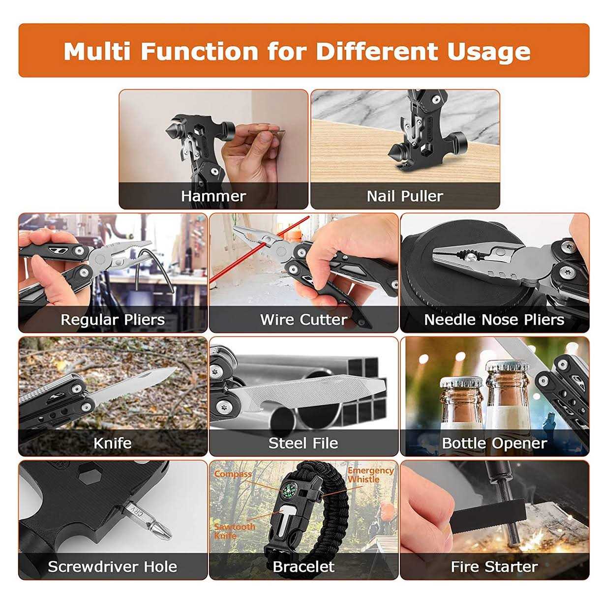 Contains 16 tools including screwdriver hole, allen wrench, mini claw hammer,nail puller,car safety hammer, safety belt cutter, slotted screwdriver, steel file, knife, phillips screwdriver (PH1/PH2), slotted screwdriver (4.5mm), bottle opener, serrated knife, regular pliers, wire cutter, needle nose pliers. Come with 5-in-1 Paracord Bracelet which includes Compass, Whistle, Bracelet (9.2 ft Rope ), Fire Starter, Scraper. Come with a durable Nylon protective pouch. Made of high-quality stainless steel with military-grade production technology, this makes it sufficient hardness and toughness. It’s not easy to break due to using a stable Phillips screw to install, the flat head hexagon screw can make it more durable and sturdy. The rust-proof and anti-corrosion high-quality steel helps it last longer. Unlike other brands’ hammer tools that are difficult to hold off, our hammer is ergonomic so you can cut the wire and remove screws easier. Included car safety hammer and safety belt cutter, these two functions are the new tools in multitools, which can save life when people suffer an emergency accident. It’s a great backup tool for car travelers. It is portable and easy to take anywhere and put to good practical use – daily! What’s in the box: WrenchHammerSheathFire StarterNail PullerScrewdriverKnifeBottle OpenerWire CutterPlierEmergency WhistleProtective Case