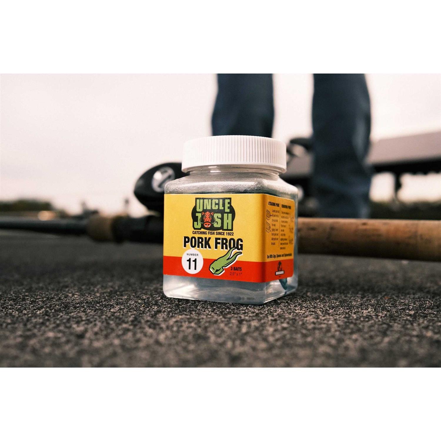 With new suppliers, Uncle Josh Pork is back on the market for all the diehard pork anglers that have been catching boatloads of bass on pork lures since 1922. The original pork trailer – the Uncle Josh #11 Pork Frog has been used for years by the weekend angler, as well as, current top bass fishing pro’s. This trailer is ideal for cold water situations or when a slower fall is needed. Uncle Josh #11 Pork Frog is super soft and flexible for a natural flow in the water and a natural feel to bass when they pick it up. Also loaded with salt for the right taste so bass hang on longer, fish the Uncle Josh #11 Pork Frog as is straight out of the bottle, or add a little bit of meat tenderizer to soften it up for added action.