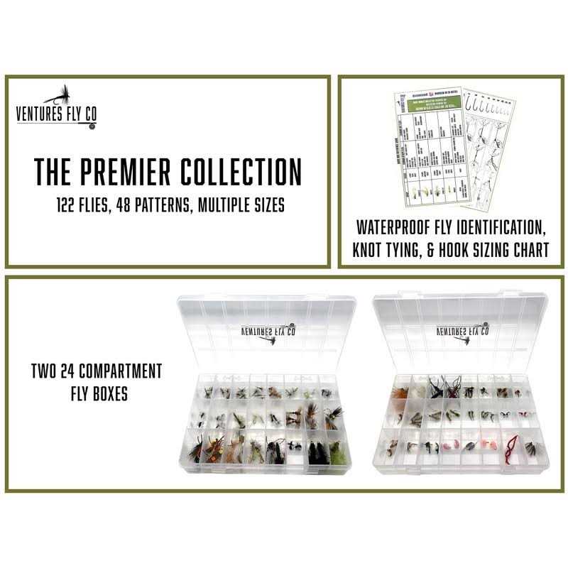 Dry Flies by VENTURES FLY CO.. Details:Ventures Fly Co. The Premier Collection- 122 Premium Flies, 48 different patterns, Various sizes. Two 24 compartment fly boxes, Fly Identification, Hook Sizing, and Knot Tying Guides included.
