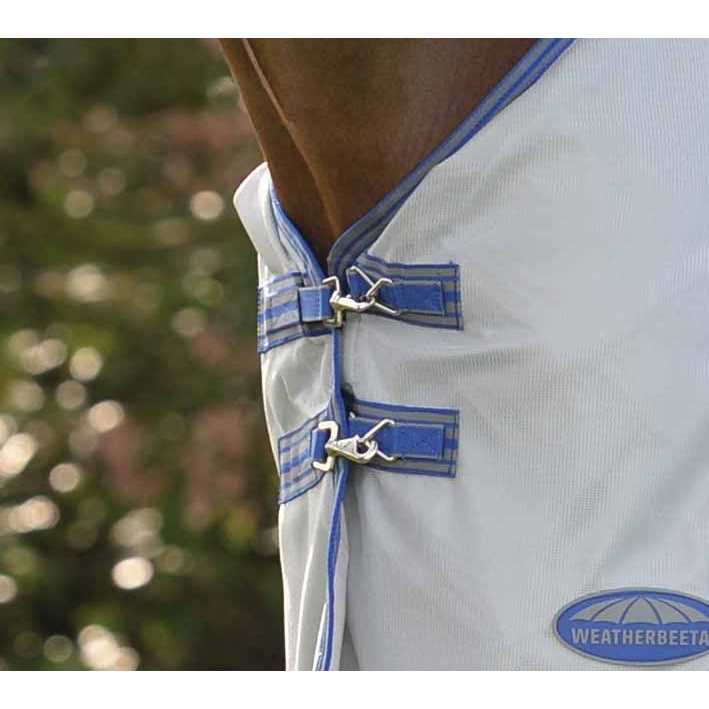A great option for the sensibly blanketed horse that can be highly sensitive. Offers high protection from UV, flies and bugs: The WeatherBeeta ComFiTec Airflow II Detach-A-Neck has a soft and durable polyester mesh outer that is breathable and provides insect protection with 75%+ UV block and Detach-A-Neck for versatility. Featuring an Ultra belly wrap for extra protection, full wrap tail flap that has a two piece design that wraps around the horses quarter’s for maximum protection, Ezi-clip front closure with touch tape, fast and easy to use, traditional side gusset for freedom of movement, 210T lined shoulders, mane and tail flap and elasticized, adjustable and removable leg straps.