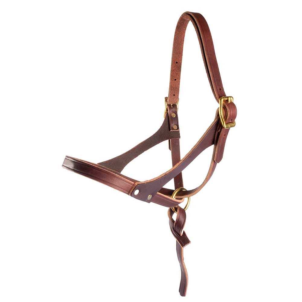 Versatile 5/8 foal halter with a figure eight design that accommodates many different sizes. Figure eight halter includes two crown sizes (16 and 20 ) that provide added adjustment for growing foals. Riveted design offers added durability for growing animals. Choose from soft, supple burgundy latigo leather or oiled canyon rose harness leather that offer performance and stylish good looks. Non-rust solid brass roller buckles offer easy on and off and a solid brass ring with catch strap provides ease in catching foals. Suckling size.